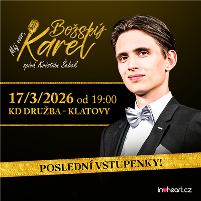 Kristián Šebek (26) se svým hudebním projektem “Můj vzor, Božský Karel”, věnovaným jeho největšímu pěveckému vzoru, dvakrát vyprodal pražskou Lucernu a jeho koncerty napříč republikou jsou již druhým rokem beznadějně vyprodané. Nyní se na něj můžete těšit v Klatovech, kde za doprovodu dvanáctičlenného Slawinski Orchestra v podání tohoto mladého zpěváka zazní průřez největšími hity českého slavíka, jako například Stokrát chválím čas, Jdi za štěstím nebo Lady Karneval. Těšit se můžete také na jeho skvělé hosty, nestárnoucí duety a další, mnohdy nečekaná, překvapení. Nenechte si ujít jedinečný koncert věnovaný jedné z největších hudebních ikon - vstupenky najdete v předprodeji právě teď!
