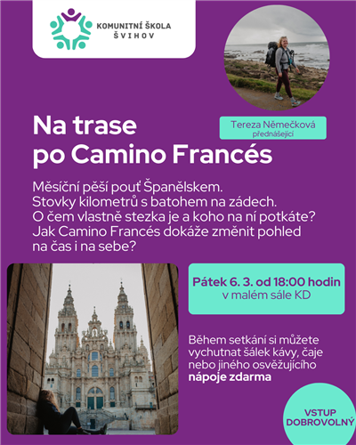 Komunitní škola Švihov Vás zve na přednášku paní Terezy Němečkové "Na trase po Camino Francés". V pátek 6. března 2026 od 18:00 hodin v malém sále KD ve Švihově