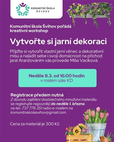 Komunitní škola Švihov Vás zve na akci "Vytvořte si jarní dekoraci". Přijďte si vytvořit vlastní jarní věnec nebo dekorativní mísu. Aranžováním Vás provede Míša Vacíková. Z důvodu zajištění dostatečného množství materiálu se registrujte nejpozději do neděle 1. března na tel. 737 776 351 nebo mailu: komunitniskolasvihov@gmai.com Cena za materiál je 300,- Kč.