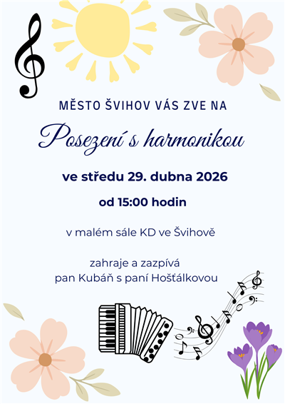 Město Švihov zve všechny dříve narozené na tradiční posezení s harmonikou. Tentokrát ve středu 29. dubna 2026 od 15:00 hodin v malém sále KD ve Švihově. Zahraje a zazpívá pan Kubáň s paní Hošťálkovou.