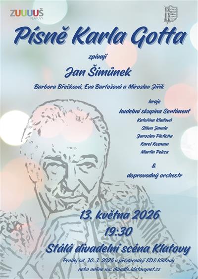 Základní umělecká škola Josefa Kličky Klatovy ve spolupráci se Stálou divadelní scénou Klatovy uvádí reprízu hudebního pořadu z roku 2025, jehož obsahem jsou výhradně písně mistra Karla Gotta. Diváci se mohou těšit na průřez hudební kariéry nejslavnějšího českého zpěváka všech dob od nejstarších písní po nejnovější. Kromě sólových skladeb nebude nouze ani o známé duety a zajímavostí hudebního zpracování bude početný doprovodný orchestr. Účinkují: Jan Šimůnek a hudební skupina Sentiment, vokální skupina ve složení Barbora Břečková, Eva Bartošová, Miroslav Jiřík, doprovodný orchestr a hosté | ||