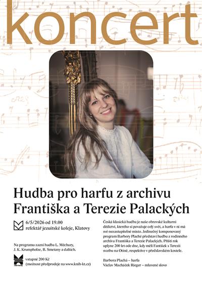 Česká klasická hudba je naše obrovské kulturní dědictví, kterého si považuje celý svět, a harfa v ní má své nezastupitelné místo. Jedinečný komponovaný program Barbory Plaché představí hudbu z rodinného archivu Františka a Terezie Palackých. Jejich notový archiv byl obsáhlý a podle historiků i sám František Palacký „harfování“ provozoval. Především ale jeho žena Terezie se svou sestrou, které na harfu hrály již od dětství a často vystupovaly v hudebním salónu svého otce Jana Měchury v dnešní Palackého ulici v Praze. Právě tam se František s Terezií do sebe zamilovali a spojovala je velká láska k hudbě. Na programu zazní hudba L. Měchury, J. K. Krumpholze, B. Smetany a dalších. Koncert doprovodí mluvené slovo potomka Františka a Terezie Palackých, pana Václava Macháčka Riegera. | ||