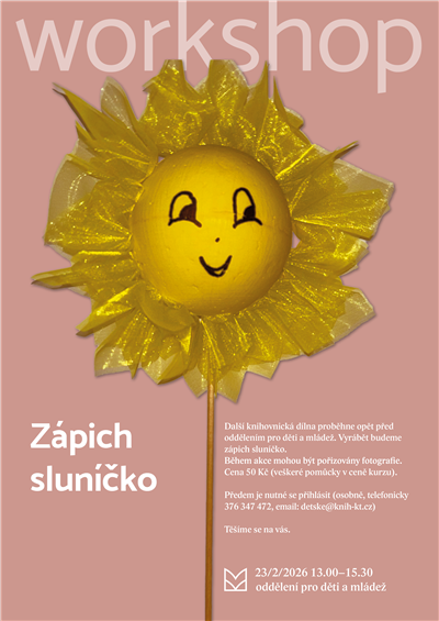 Přijďte si s námi vyrobit sluníčkový zápich. Knihovnická dílna proběhne jako obvykle před oddělením pro děti a mládež. Kurzovné 50 Kč. Těšíme se na vás!