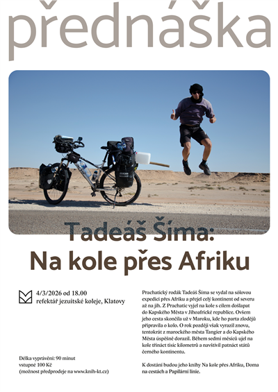 Zveme vás na další cestopisnou přednášku Tadeáše Šímy: Na kole přes Afriku. Vstupné 100 Kč na místě, v předprodeji 70 Kč, děti v doprovodu dospělého zdarma.