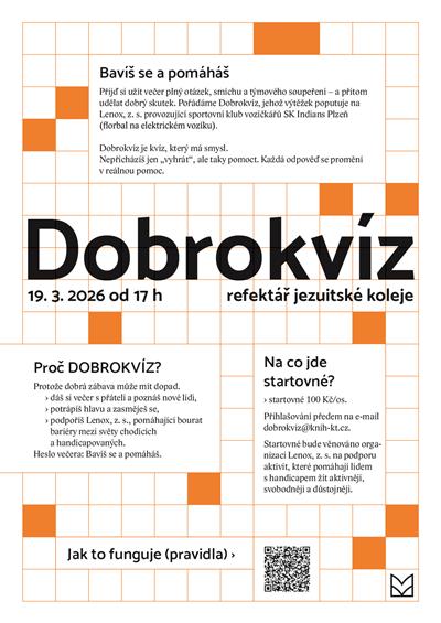 Přijďte si užít večer plný otázek, smíchu a týmového soupeření – a přispět tím na dobrou věc. Výtěžek Dobrokvízu poputuje na Lenox, z. s. provozující sportovní klub vozíčkářů SK Indians Plzeň (florbal na elektrickém vozíku).