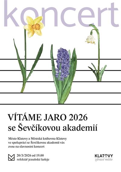 Město Klatovy a Městská knihovna Klatovy ve spolupráci s Ševčíkovou akademií vás zvou na slavnostní koncert, jímž přivítáme jaro 2026. Koncert se uskuteční v refektáři jezuitské koleje v Klatovech a je otevřený pro všechny, kteří milují krásnou hudbu.