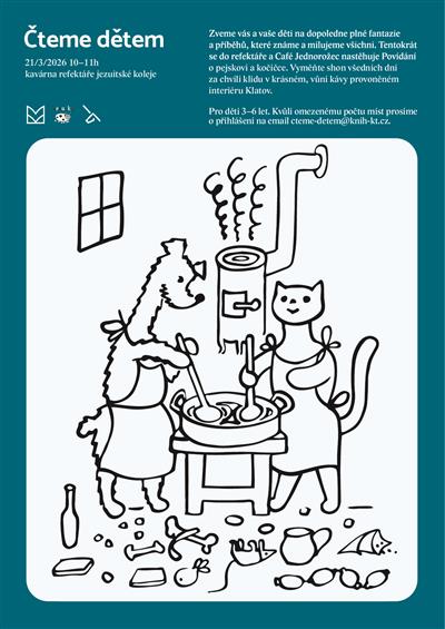 Zveme vás a vaše děti na dopoledne plné fantazie a příběhů, které známe a milujeme všichni. V sobotu 21. března 2026 od 10.00 do 11.00 hodin si v refektáři a Café Jednorožec společně přečteme knihu Povídání o pejskovi a kočičce. Vyměňte shon všedních dní za chvíli klidu v krásném, vůní kávy provoněném interiéru Klatov. Pro děti 3–6 let. Kvůli omezenému počtu míst prosíme o přihlášení na e-mail cteme-detem@knih-kt.cz.