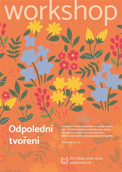 Přijďte si užít odpoledne plné tvoření. Vyrobit si můžete jarní a dřevěné dekorace, placky či náramky z korálků. Těšíme se na vás!