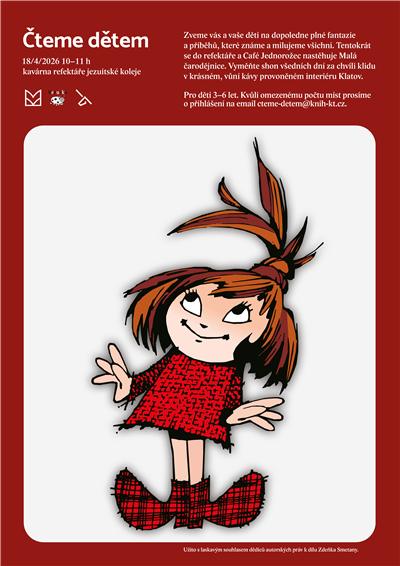 Zveme vás a vaše děti na dopoledne plné fantazie a příběhů, které známe a milujeme všichni. V sobotu 18. dubna 2026 od 10.00 do 11.00 hodin si v refektáři a Café Jednorožec společně přečteme z knihy Malá čarodějnice. Vyměňte shon všedních dní za chvíli klidu v krásném, vůní kávy provoněném interiéru Klatov. Pro děti 3–6 let. Kvůli omezenému počtu míst prosíme o přihlášení na e-mail cteme-detem@knih-kt.cz. | ||