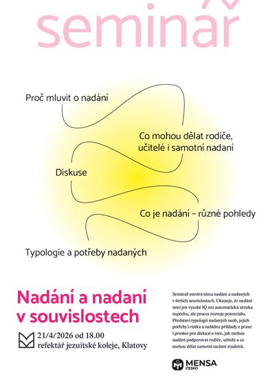 Seminář představí typologii nadaných osob, jejich potřeby a rizika. Nabídne příklady z praxe i prostor pro diskusi o tom, jak mohou nadání podporovat rodiče, učitelé a co mohou dělat samotní nadaní studenti.