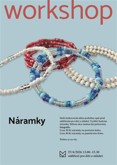 Přijďte na další knihovnickou dílnu, kde si vyrobíme náramky z korálků. Cena 20 Kč náramky na pružném lanku, 40 Kč náramky na paměťovém drátku.