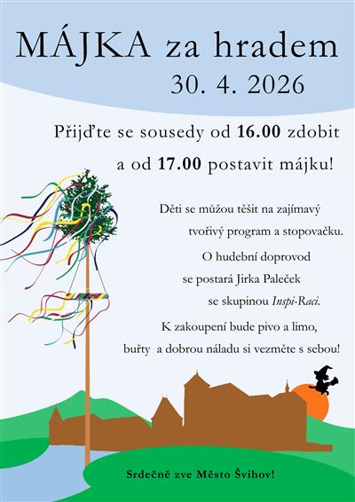 Jste srdečně zváni na májku za hradem. Ve čtvrtek 30. dubna 2026 od 16:00 hodin zdobení, od 17:00 hodin stavění májky. Děti se můžou těšit a zajímavý tvořivý program a stopovačku. O hudební doprovod se postará Jirka Paleček a hudební skupina Inspi-Raci. K zakoupení pivo a limo. Vuřty a dobrou náladu vezměte s sebou.