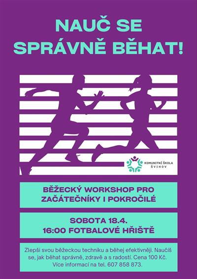 Komunitní škola Švihov Vás zve na běžecký workshop pro začátečníky i pokročilé běžce. V sobotu 18. dubna 2026 v 16:00 hodin na fotbalovém hřišti ve Švihově. Cena 100,- Kč. Více informací na tel. 607 858 873.