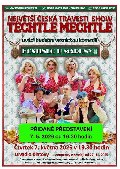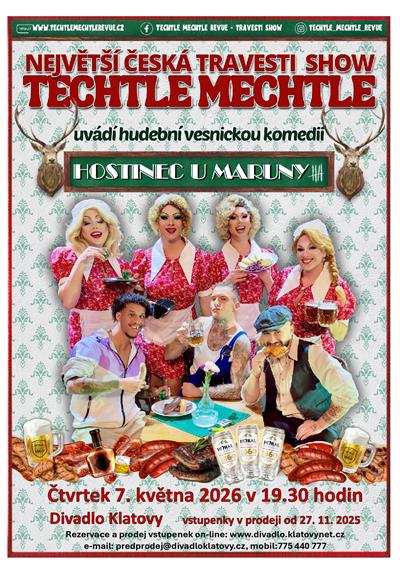 Techtle Mechtle revue je v současné době nejúspěšnější česká show na poli divadelní scény. V podání Techtle Mechtle se vždy jedná o propracované divadelní představení s výpravnou scénou a více jak 80-ti kostýmy. Všechna představení jsou jednou velkou komedií, a to od začátku až do konce. Má to jen jeden háček - všechny role, a to včetně těch dámských, tu hrají pouze muži a ti jsou navíc k nerozeznání od skutečných žen. Pánové Lukáš, Martin, Nikolas a Jarek společně s tanečníky Štěpánem, Sayem a Danem pro Vás tentokrát připravili další bláznivou komedii z prostředí české vesnické hospody. Rázná hospodská Maruna, která má nejen celý svůj hostinec, ale také všechny svoje štamgasty pod palcem a k tomu příběhy, které píše sám život. Co všechno se dá zažít v jedné vesnické hospůdce během přípravy hasičského plesu, to uvidíte právě v české hudební komedii "Hostinec u Maruny". Chybět nebude pořádná dávka českého humoru, láska, hospodská rvačka a pivo poteče jak jinak než proudem. Samozřejmě zazní během večera české hospodské písničky, které si budete broukat ještě na cestě domů a i celý druhý den... Všechna představení jsou vlastní autorskou tvorbou pánů z Techtle Mechtle revue, a to od scénáře, přes dialogy, hudbu, návrhy scény i kostýmů. Nenechte si ujít strhující hudební představení v podání nejúspěšnějších českých travesti umělců a jejich tanečníků. Více informací najdete na www.techtlemechtlerevue.cz nebo na Facebooku: Techtle Mechtle revue *** VYPRODÁNO *** | ||