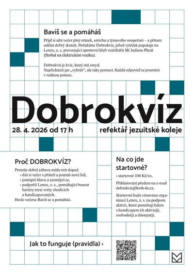Přijď si užít večer plný otázek, smíchu a týmového soupeření – a přitom udělat dobrý skutek. Pořádáme Dobrokvíz, jehož výtěžek poputuje na Lenox, z. s. provozující sportovní klub vozíčkářů SK Indians Plzeň