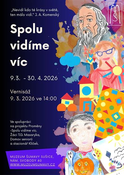 Ve spolupráci na projektu Proměny - Spolu vidíme víc. Žáci T.G. Masaryka, Domov seniorů a stacionář Klíček. Výstava Spolu vidíme víc vznikla v rámci celostátní soutěže Měníme svět k lepšímu s Komenským, která navazuje na odkaz Jana Amose Komenského a jeho víru v lidskost, vzdělanost a vzájemné porozumění. Projekt je inspirován jeho myšlenkou: „Není-li kdo té krásy v světě, ten málo vidí.“ Cílem projektu bylo rozvíjet mezigenerační a meziskupinové vztahy prostřednictvím společné výtvarné tvorby. Do projektu se zapojili žáci 5. ročníků základní školy T. G. Masaryka Sušice, klienti domova pro seniory v Sušici a klienti denního stacionáře pro osoby se zdravotním postižením Klíček. Společně tvořili, malovali, kreslili a fotografovali. Učili se spolupracovat, naslouchat si a objevovat krásu v rozdílnosti i podobnosti. Součástí projektu byla také výroba pohlednic s výtvarnými díly všech zúčastněných. Ty byly prodávány na školním jarmarku a výtěžek byl využit k podpoře další výtvarné činnosti seniorů a osob se zdravotním postižením. Závěrečná výstava představuje výsledky tohoto společného snažení a zároveň symbolicky uzavírá celý projekt. Je především setkáním generací, svědectvím spolupráce a důkazem, že umění dokáže propojovat lidi bez ohledu na věk či omezení. | ||