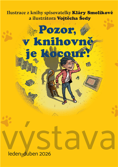 Zveme vás na výstavu Kláry Smolíkové Pozor, v knihovně je kocour! Výstava je ke zhlédnutí na schodišti Městské knihovny Klatovy do 30. dubna 2026.